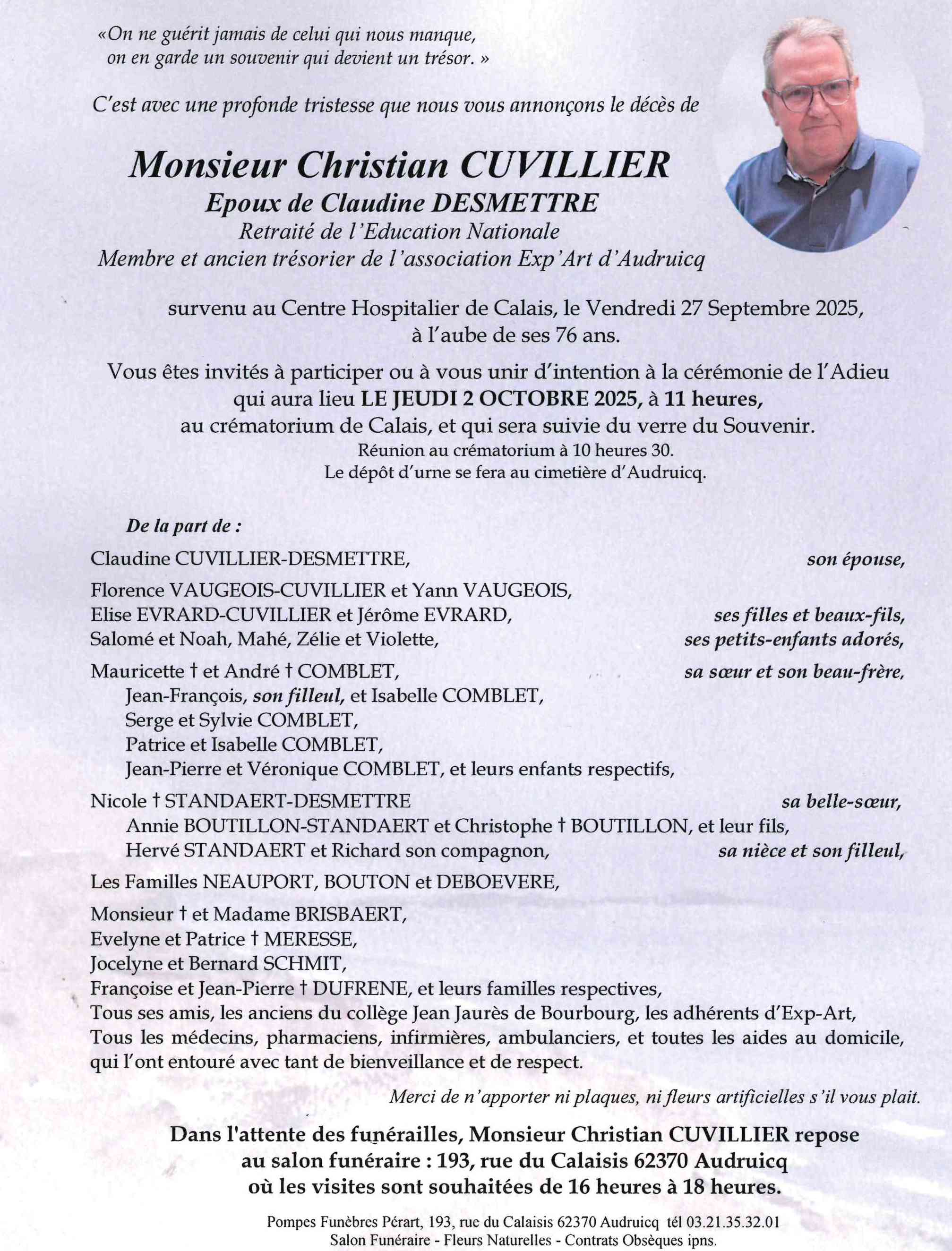 Monsieur Christian CUVILLIER survenu le 27 septembre 2025 à Calais, à l'aube de ses 76 ans.